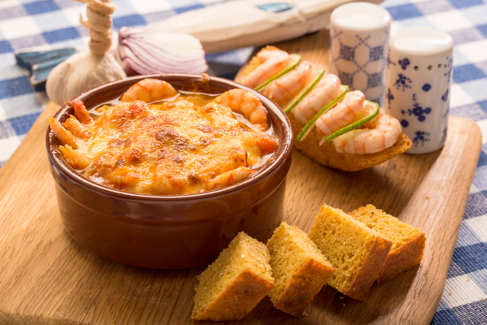 Taptaze karidesler biber, domates, mantar ve krema ile hazırlanır üzerinde eritilmiş kaşar peyniri ile servis edilir.