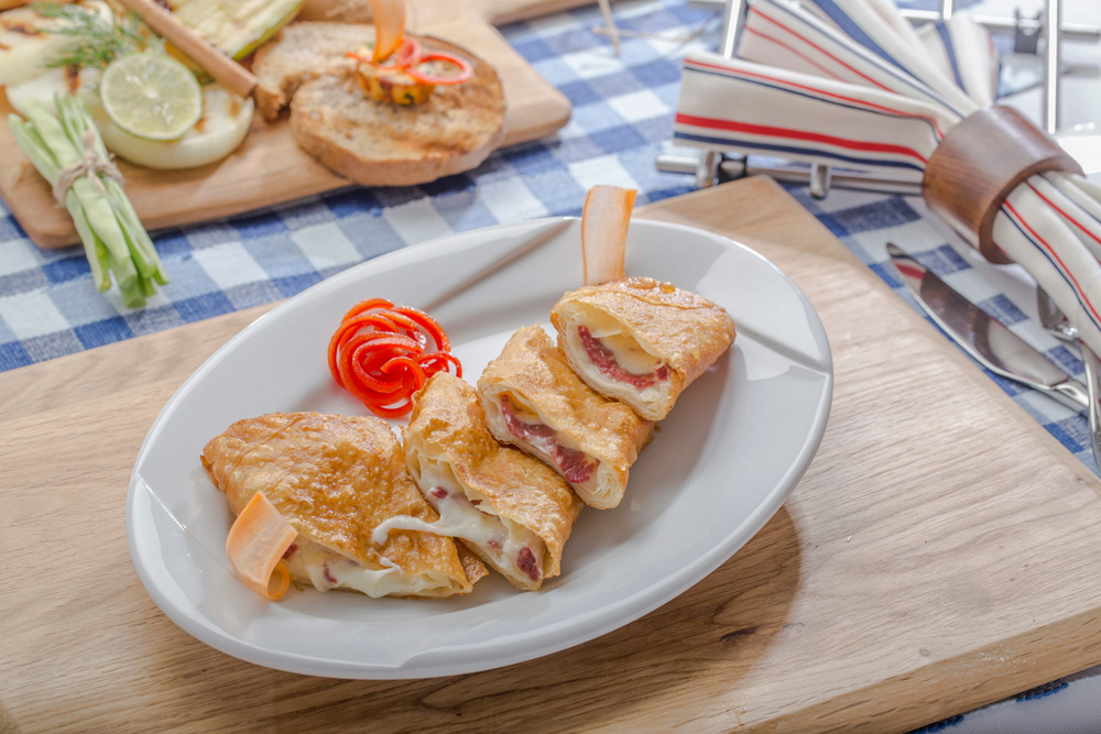 Yufka, kaşar peyniri, pastırma ve domates ile hazırlanır ara sıcak olarak servis edilir.