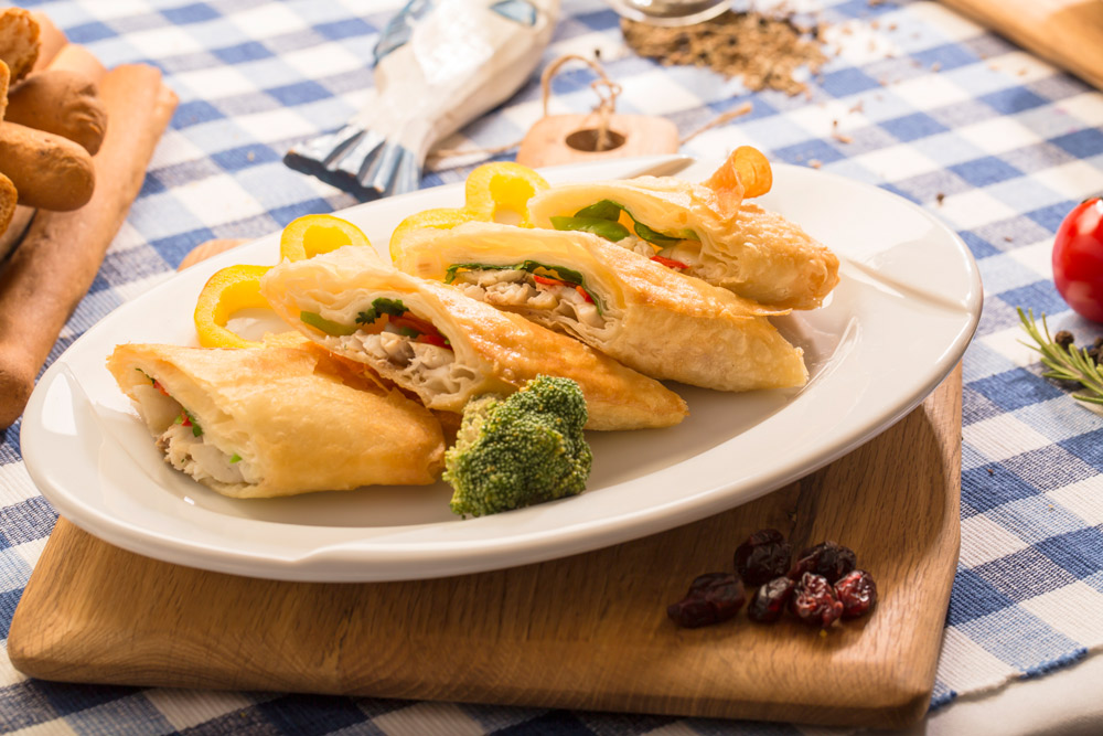 Levrek balığı, mantar, sivri biber, maydanoz ve kırmızı biber ile yufka kızartılır ara sıcak olarak servis edilir.