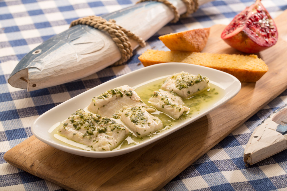 Levrek balığı, fesleğen sosu, limon sosu ve zeytinyağı ile servis edilir.