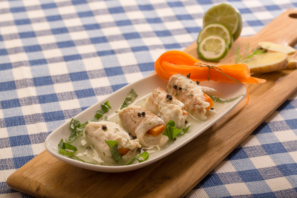Levrek balığı, havuç ve karides ile sarılarak limon, fesleğen sosu ve tane karabiber ile servis edilir.